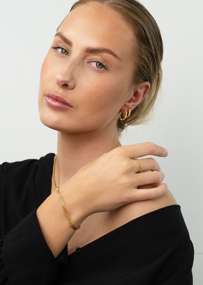 Vores premium rustfri stål er af højeste kvalitet, sikkerhedstestet og fuldt EU-godkendt. Guldbelagte designs bruger avanceret PVD-belægning, som gør dem op til 10× mere holdbare end traditionel forgyldning. De er meget slidstærke – selv i havet, poolen eller fitness – men vi anbefaler stadig at behandle dem med omtanke. Vi tilbyder 2 års garanti på vores produkter.