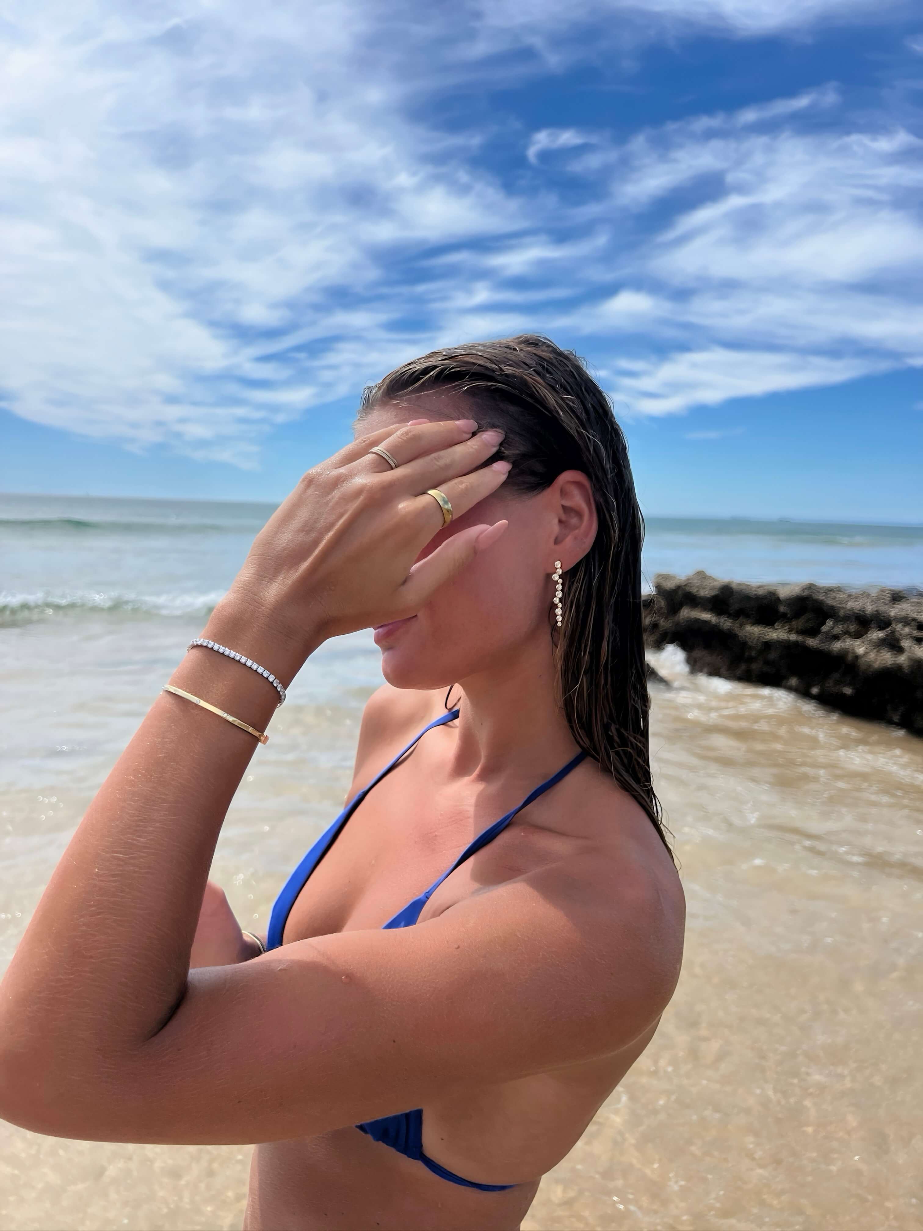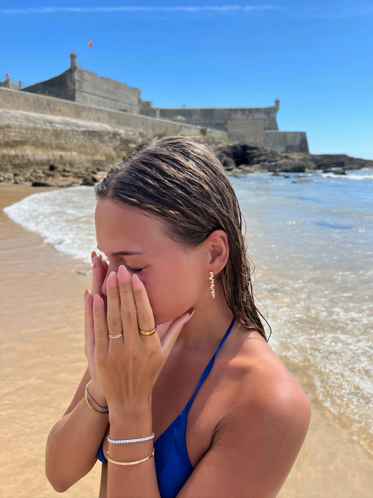 Vores premium rustfri stål er af højeste kvalitet, sikkerhedstestet og fuldt EU-godkendt. Guldbelagte designs bruger avanceret PVD-belægning, som gør dem op til 10× mere holdbare end traditionel forgyldning. De er meget slidstærke – selv i havet, poolen eller fitness – men vi anbefaler stadig at behandle dem med omtanke. Vi tilbyder 2 års garanti på vores produkter.